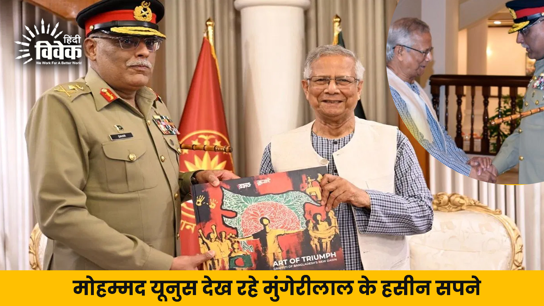 विगत दिनों पाकिस्तानी सेना के नंबर दो अधिकारी ज्वांइट चीफ ऑफ स्टॉफ कमेटी के अध्यक्ष जनरल साहिर शमशाद मिर्जा को बांग्लादेश के अंतरिम प्रमुख मोहम्मद यूनुस ने उपहार में एक पुस्तक दी है जिसका नाम है आर्ट ऑफ ट्रायंफः बांग्लादेश द न्यू डान और साथ में एक विवादित मानचित्र भी दिया है।
