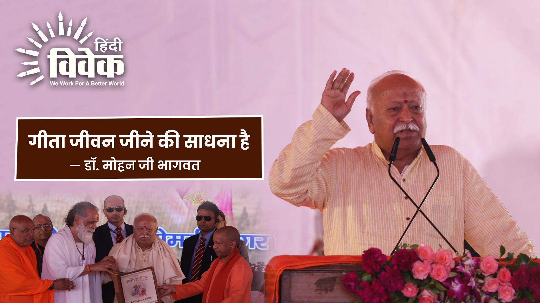 दिव्य गीता कार्यक्रम में मुख्य अतिथि के रूप में उपस्थित राष्ट्रीय स्वयंसेवक संघ के पू. सरसंघचालक डॉ. मोहन जी भागवत ने कहा कि, गीता को केवल पढ़ना नहीं, बल्कि उसे जीवन में उतारकर जीना है। आज यह कार्यक्रम सम्पन्न अवश्य हुआ है, परन्तु हमारा कर्तव्य केवल कार्यक्रम तक सीमित नहीं हो जाता। हम सब यहाँ इसलिए उपस्थित हैं कि गीता के संदेश को अपने जीवन में चरितार्थ करना है। गीता के कुल 700 श्लोक हैं; यदि हम प्रतिदिन दो श्लोकों का अध्ययन कर उन पर मनन करें और जो सार प्राप्त हो उसे व्यवहार में लाएँ, जीवन की प्रत्येक कमी का परिमार्जन करें, तो वर्षभर में हमारा जीवन गीतामय बनने की दिशा में अत्यन्त आगे बढ़ सकता है।