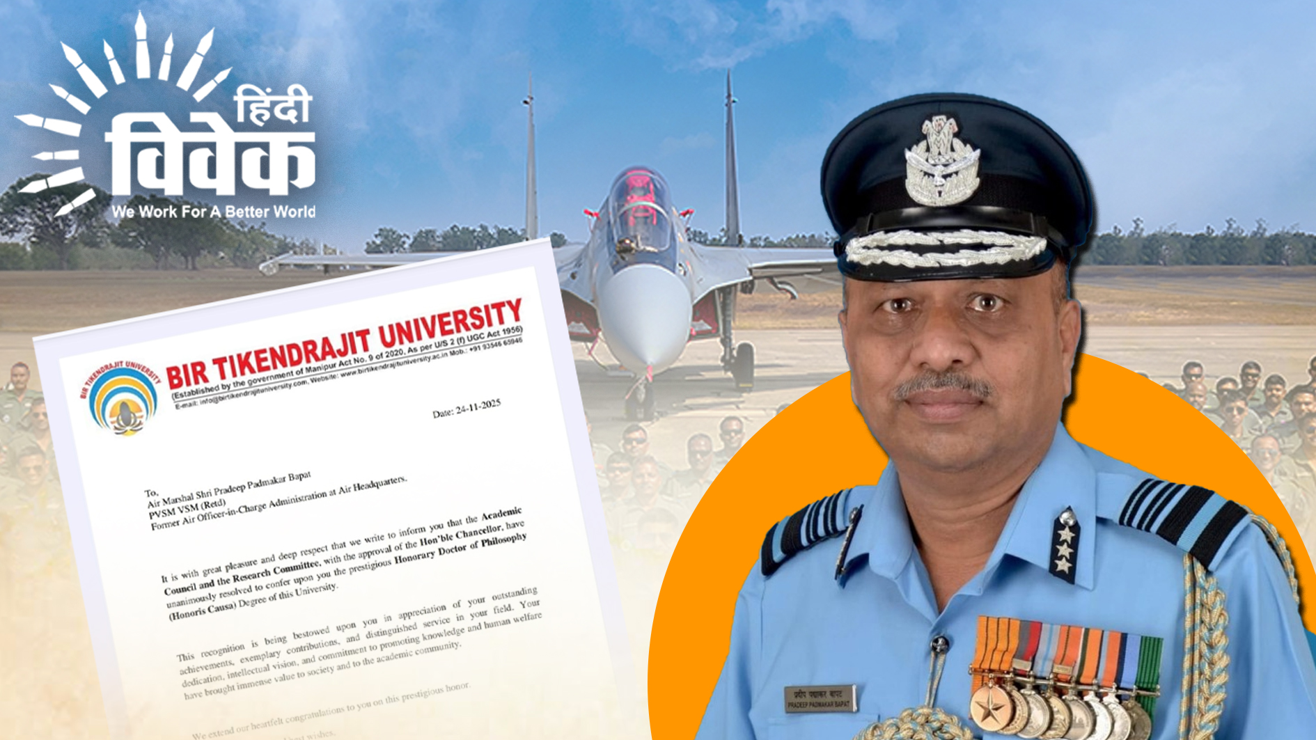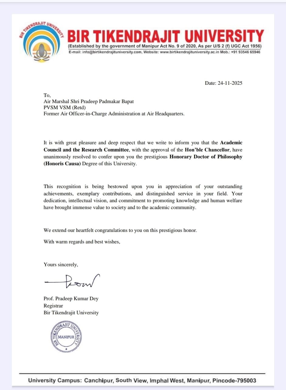 पुणे। इम्फाल, मणिपुर स्थित बिर टिकेंद्रजीत विश्वविद्यालय ने एयर मार्शल प्रदीप बापट (सेवानिवृत्त) को प्रतिष्ठित एवं सम्माननीय मानद डॉक्टरेट (डॉक्टर ऑफ फिलॉसफी) प्रदान करने की घोषणा की है। उक्त सम्मान उनके द्वारा देशसेवा में दिए गए उत्कृष्ट एवं अमूल्य योगदान के लिए प्रदान किया जा रहा है।
