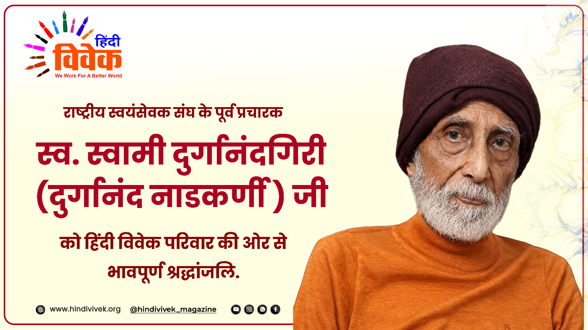 राष्ट्रीय स्वयंसेवक संघ के पूर्व प्रचारक, ‘हिंदू एकजूट’ नामक संगठन का कार्य सम्पूर्ण महाराष्ट्र में विस्तारित करनेवाले स्वामी दुर्गानंदगिरी (दुर्गानंद नाडकर्णी) जी का कल रात लातूर (महाराष्ट्र) में देवलोकगमन हो गया. पृथ्वीलोक पर आध्यात्मिक यात्रा का समापन कर उनकी आत्मा-परमात्मा में विलीन हो गई.