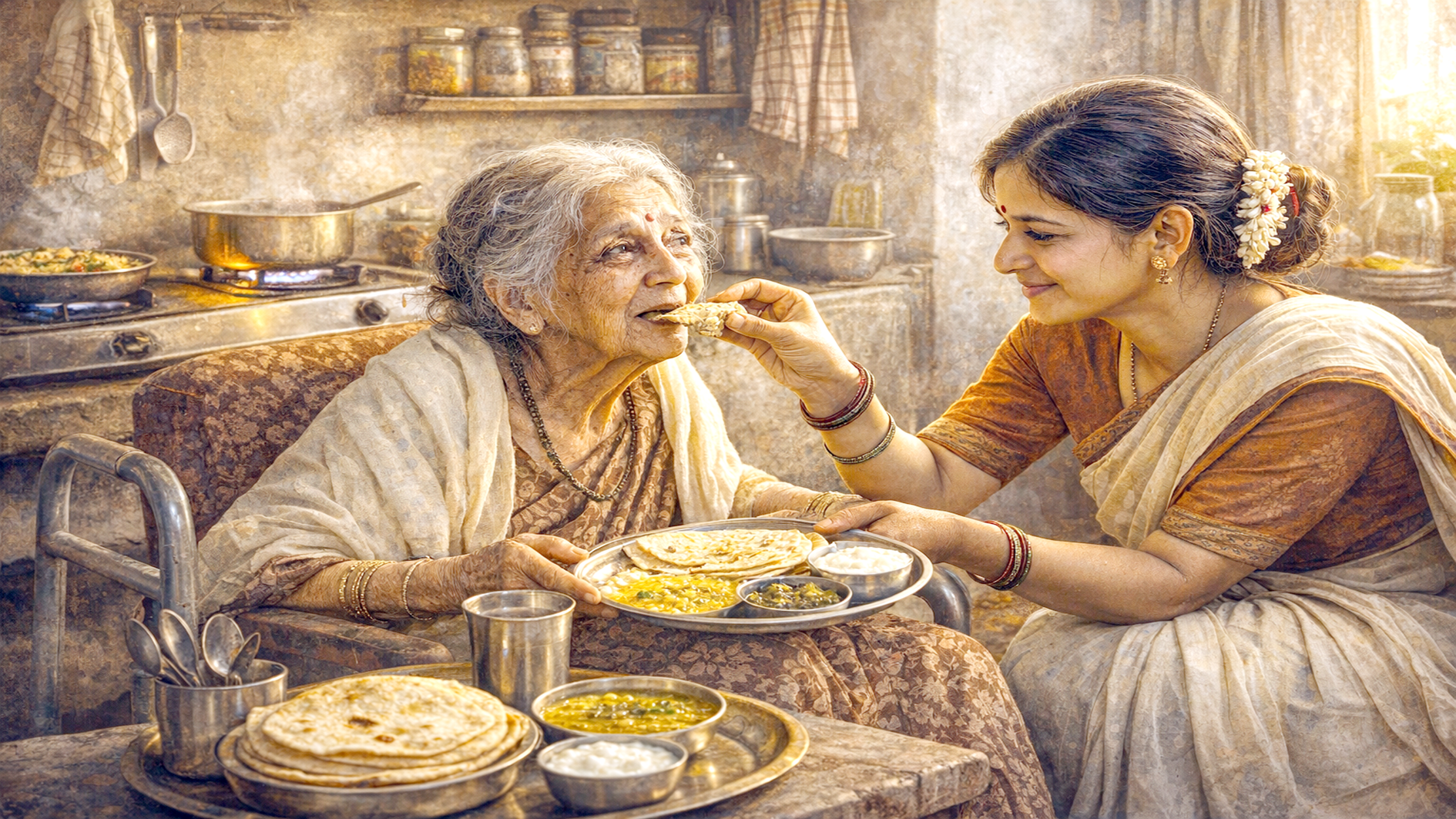 चंद्रा ने बिना देर किए रसोई संभाल ली। उसने मूंग की दाल, भिंडी की सब्जी, दही और नरम फुल्के बनाकर थाली में सजाए और बिमला देवी के पास ले जाकर बोली, अम्मा जी, भोजन तैयार है। आप भोजन कर लीजिए।