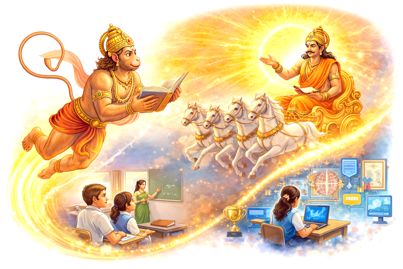 सबसे पहले शिक्षक का चयन। हनुमानजी माता-पिता की सलाह से शिक्षा के लिए सूर्यदेव के पास गए, लेकिन सूर्यदेव के पास समय न था, वे गतिमान रहते हैं। हनुमानजी ने उनकी गति से उनके सम्मुख चलते हुए शिक्षा ग्रहण की। सूर्यदेव को प्रकाश, ज्ञान और ऊर्जा संचार में सर्वश्रेष्ठ माना जाता है। हनुमानजी ने उन्हीं से शिक्षा ली। हनुमानजी द्वारा शिक्षा ग्रहण करने के संकल्प और अपने गुरु के प्रति एकाग्रता का संदेश है। जो युवा एकाग्रता के साथ क्लॉस अटेंड करते हैं, पढ़ाई जा रही शिक्षा को पूर्णता के साथ ग्रहण करते हैं वही बच्चे प्रथम श्रेणी और प्राविण्य सूची में अपना स्थान बनाते हैं।